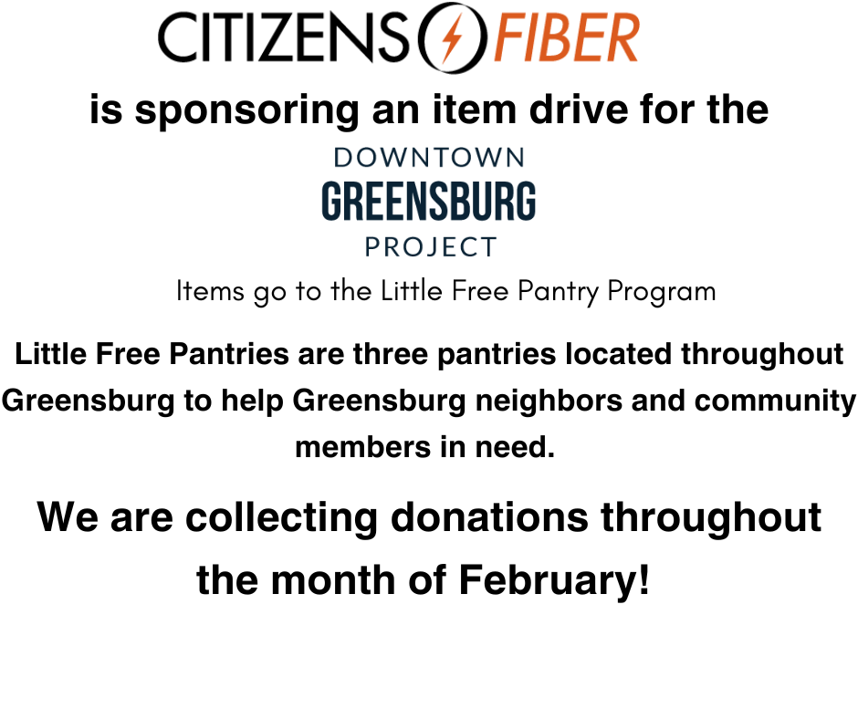 Citizens Fiber is collecting items for Downtown Greensburg Project’s Little Free Pantries Drive. The Little Free Pantries are three pantries