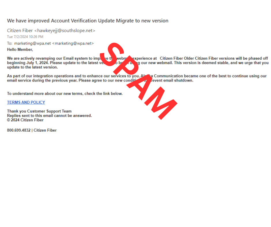 Attention Customers: While Citizens Fiber is always doing the best we can to prevent spam, phishing, and other potentially harmful